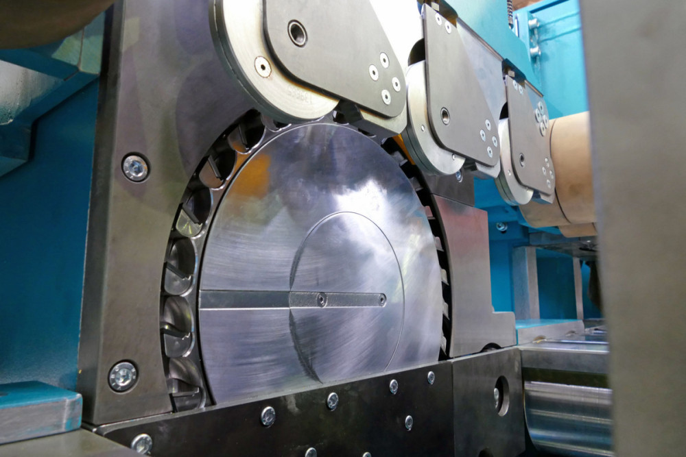 Schwere Maschine mit gegenüberliegendem unteren und oberen Rotor und schwimmenden Vertikalspindeln für anspruchsvolle Kalibrierung von Lambinderlamellen.