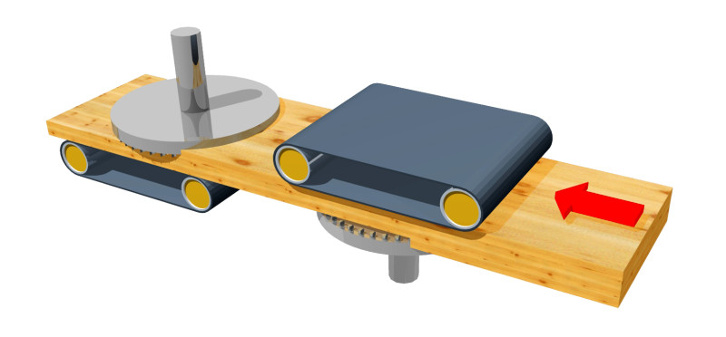 Machines with a top rotor and feeding belt below are used for calibration of very thin workpieces, such as hardwood top layers for production of engineered flooring.